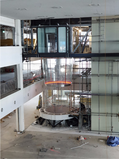 Projected visualization and photographs from the vertical wind tunnel installation process inside a shopping mall building.
